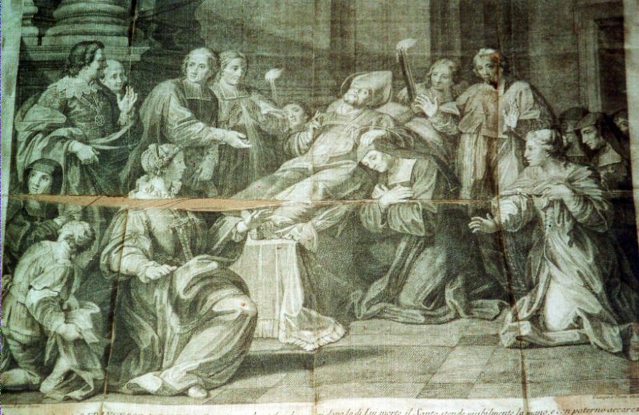 1632: Der Leichnam des hl. Franz von Sales wird im Zuge des Seligsprechungsprozesses exhumiert und sein unversehrter Leichnam aufgebahrt. Johanna Franziska von Chantal bittet, die linke Hand des hl. Franz von Sales zum Segen auf ihr Haupt zu legen. Dabei soll sich die rechte Hand im Segensgestus bewegt haben. Abbildung aus dem Schloss Sales bei Thorens, Frankreich