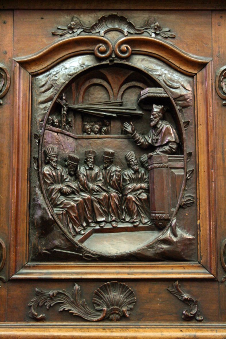 Während eine Predigt des hl. Franz von Sales beginnt das Kreuz ihm gegenüber zu strahlen. Holzrelief auf der Kanzel in der Kathedrale von Annecy, Frankreich