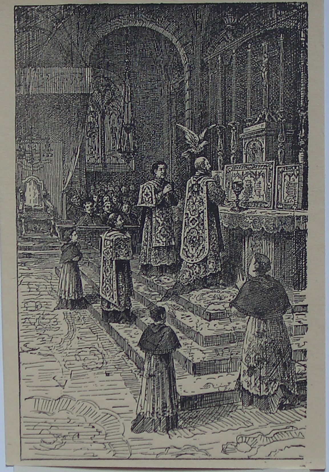 Während einer Vesper in Annecy setzte sich eine Taube auf die Schultern des hl. Franz von Sales. Stich im Heimsuchungskloster von Solothurn, Schweiz