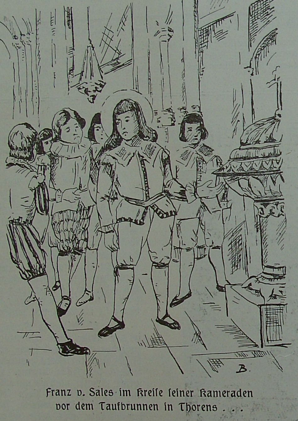 Franz von Sales im Kreise seiner Kameraden vor dem Taufbrunnen von Thorens: aus: Salesius Stimmen, 13. Jahrgang, Januari 1930, Heft 1, Seite 28, Zeitschrift der deutschen Provinz der Oblaten des hl. Franz von Sales, Overbach