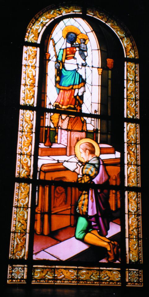 Franz von Sales in der Krise: Franz von Sales betet vor der Madonna in Saint Etienne des Gres im Januar 1587 und beendet seine schwere Krise. Glasfenster in der Kirche Neully sur Seine bei Paris, wo die Madonna heute steht.