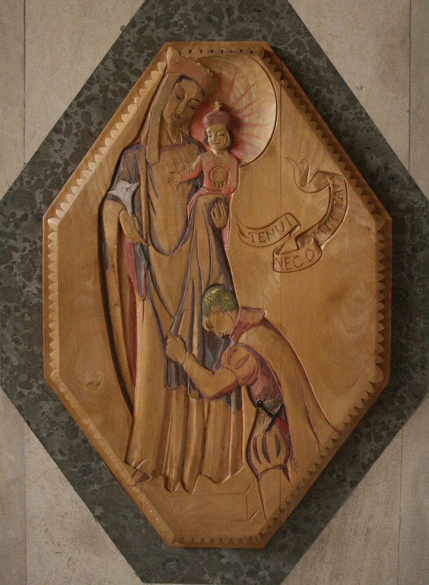 Franz von Sales betet vor der Madonna in Saint Etienne des Gres im Januar 1587 und beendet seine schwere Krise. Holzrelief im Oblatinnenkloster in Troyes, Frankreich.