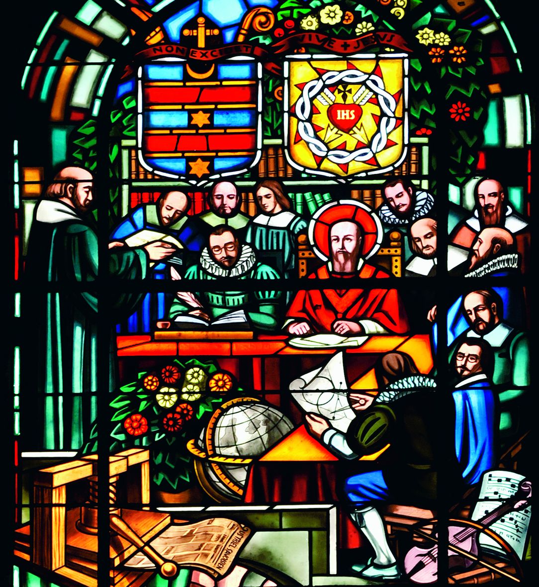 Franz von Sales, GrĂ¼nder der Academie Florimontagne. Ausschnitt aus einem Glasfenster in der Basilika der Heimsuchung von Annecy, Frankreich