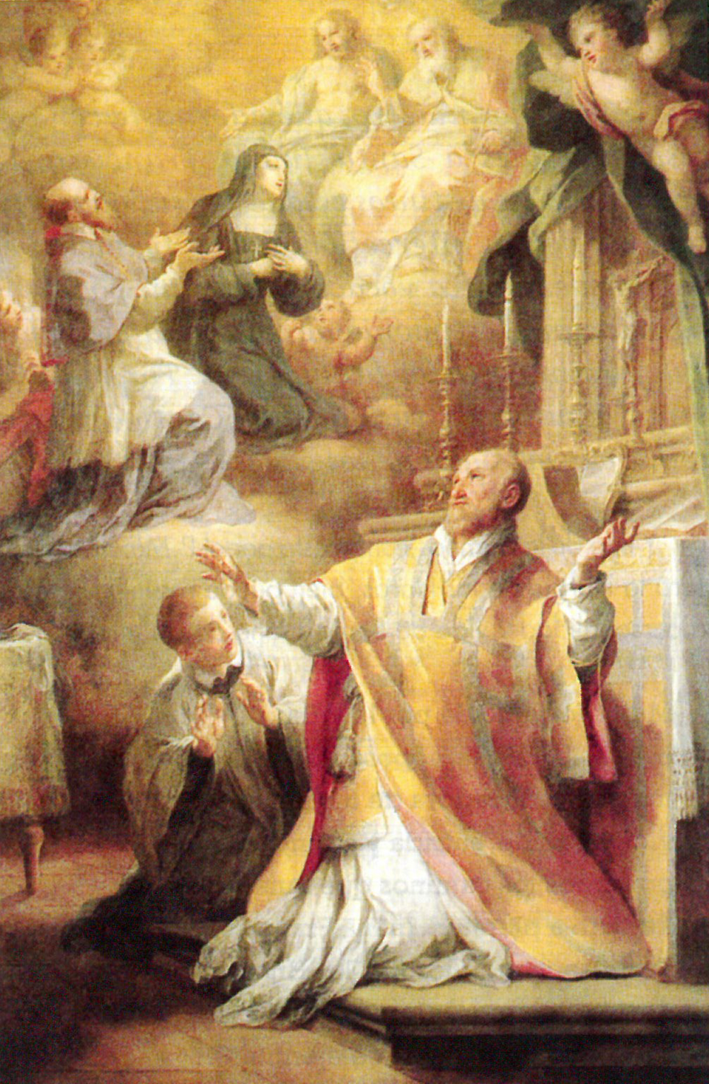 Kugel-Vision Vinzenz von Pauls: Gemälde im Heimsuchungskloster von Rom, Italien. Beim Tod von Johanna Franziska von Chantal sah Vinzenz zwei Lichtkugeln in den Himmel steigen und sich mit einer großen Kugel vereinen. Ein Zeichen der Heiligkeit von Franz von Sales und Johanna Franziska.
