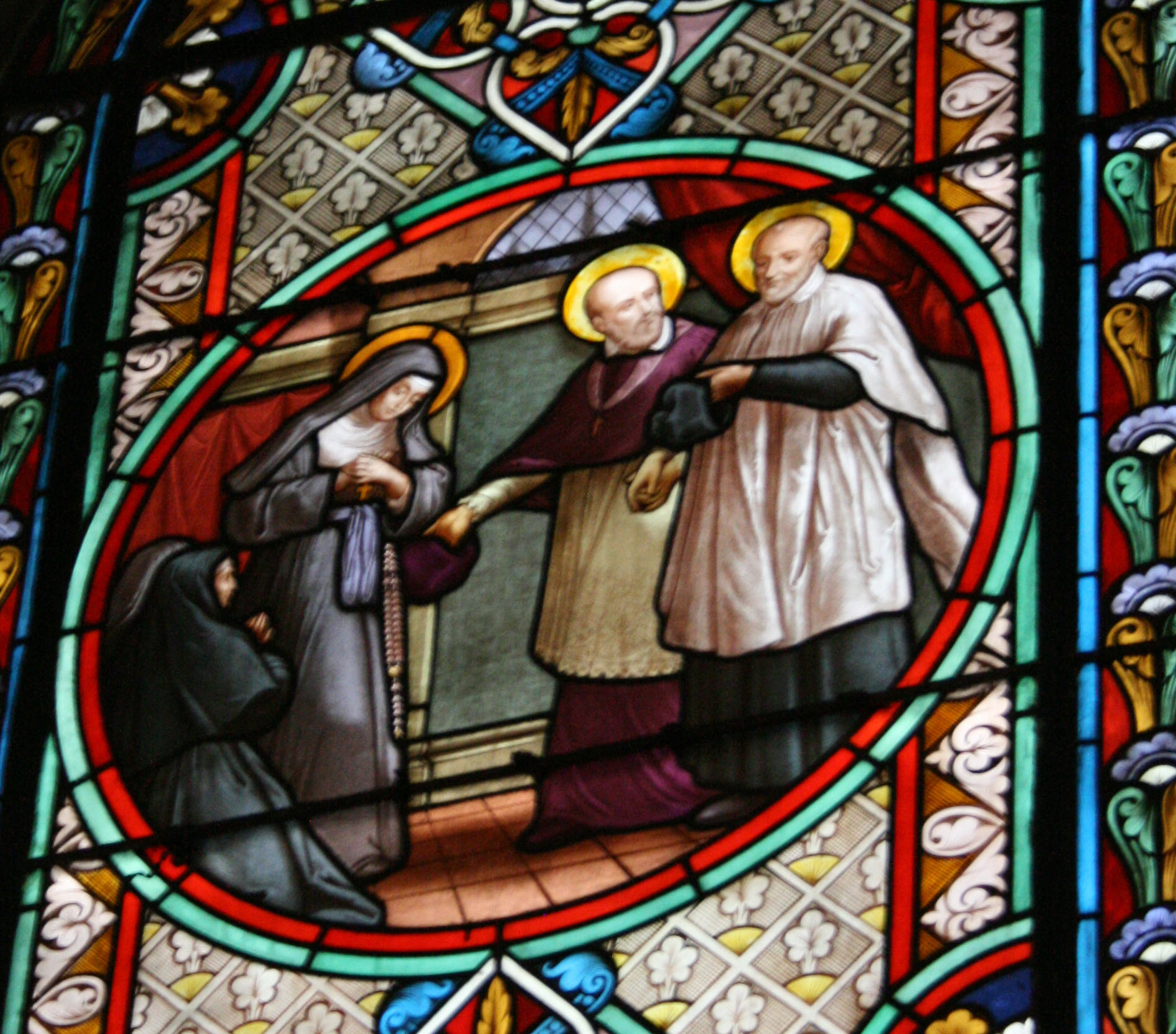 Franz von Sales begegnet Vinzenz von Paul in Paris, links Johanna Franziska von Chantal: Glasfenster in der alten Pfarrkirche Franz von Sales von Paris, Frankreich.