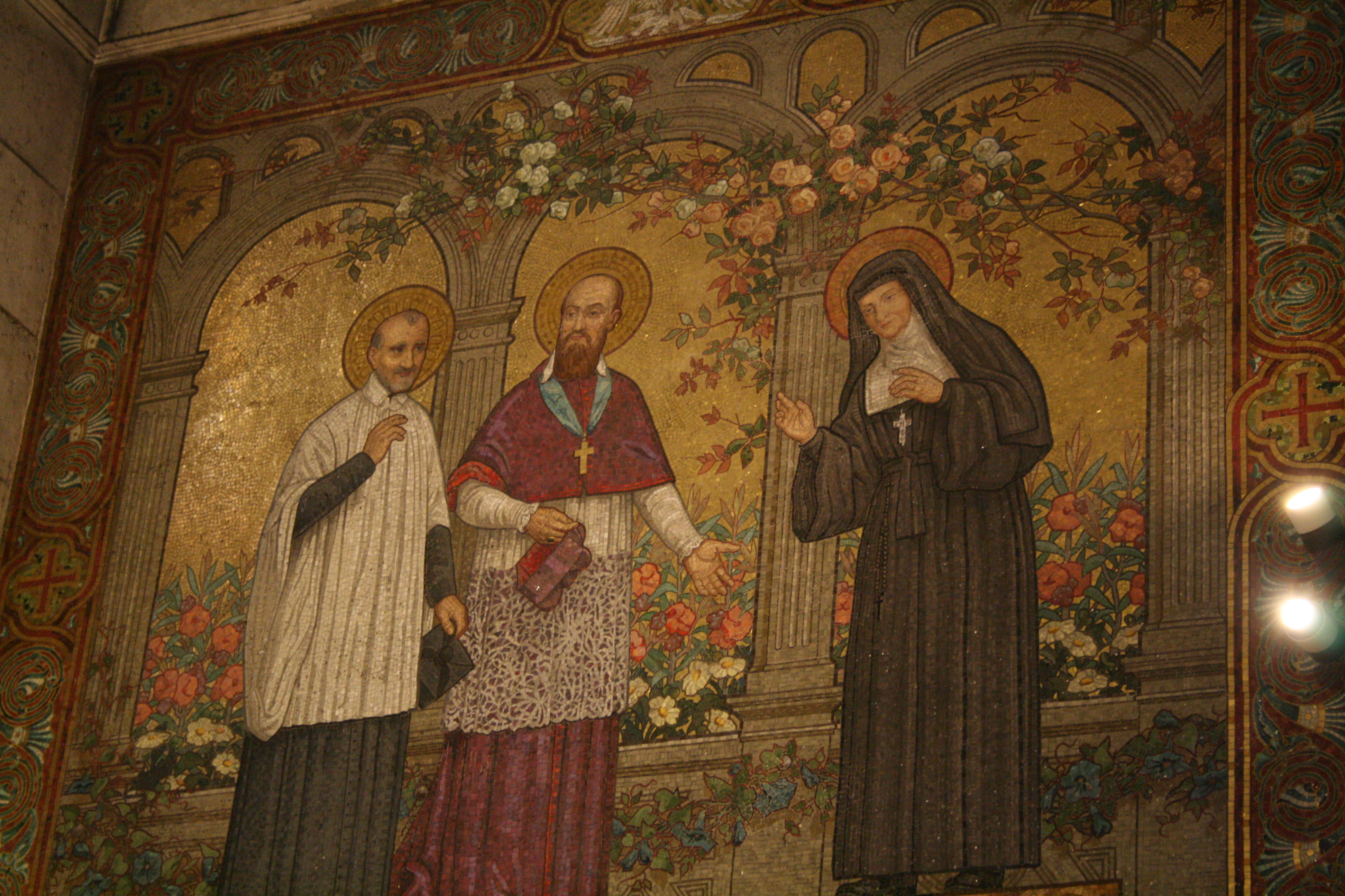 Franz von Sales begegnet Vinzenz von Paul in Paris, rechts Johanna Franziska von Chantal: Mosaik in der Basilika Sacre Coeur in Paris, Frankreich.