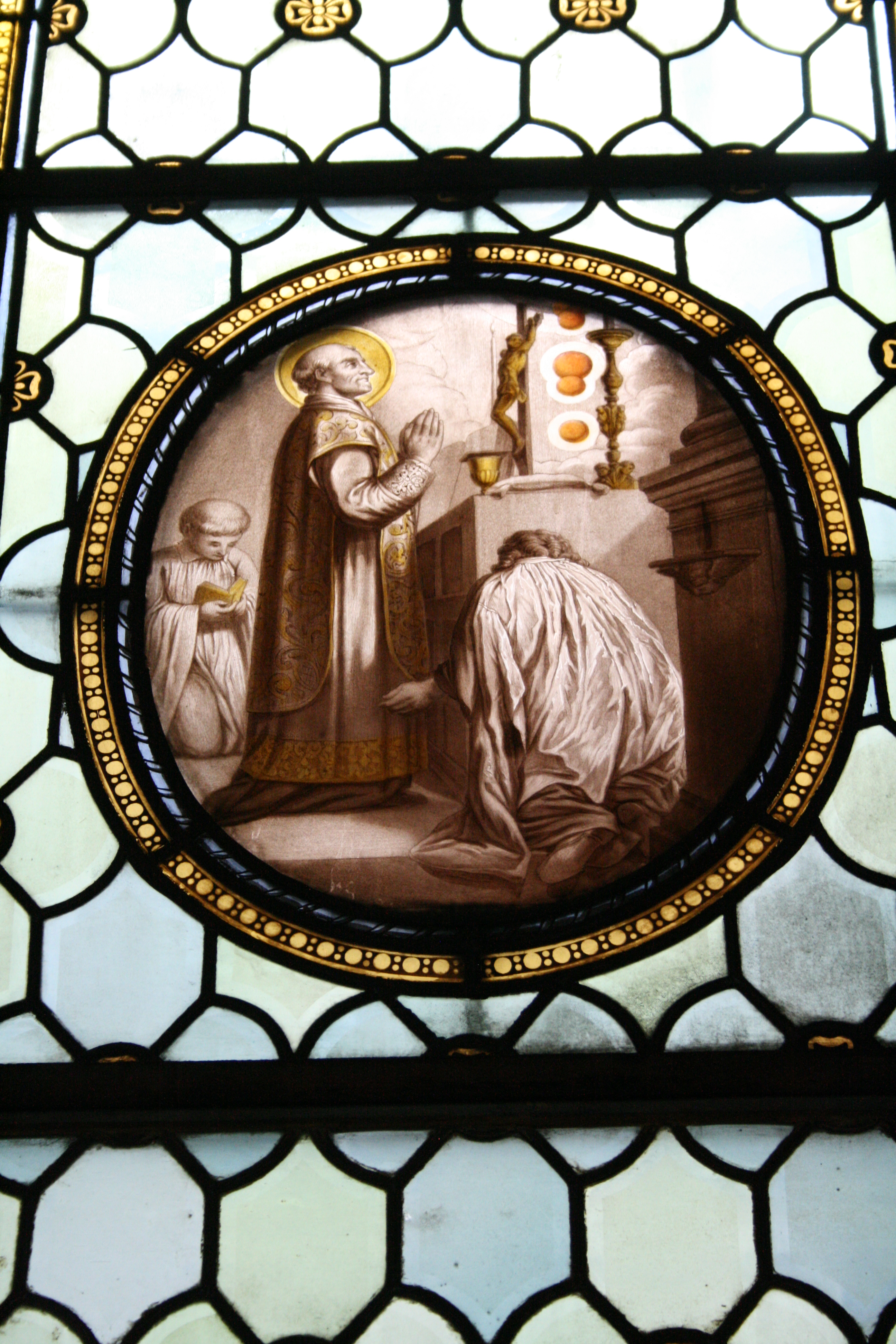 Kugel-Vision Vinzenz von Pauls: Glasfenster in der Chapelle Saint-Vincent-de-Paul von Paris, Frankreich. Beim Tod von Johanna Franziska von Chantal sah Vinzenz zwei Lichtkugeln in den Himmel steigen und sich mit einer großen Kugel vereinen. Ein Zeichen der Heiligkeit von Franz von Sales und Johanna Franziska.