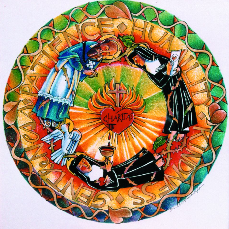 Gemälde von Michael McGrath OSFS in Samarpanaram, Indien. Im Uhrzeigersinn: Chantal, Alacoque, Franz von Sales umgeben von den Tugenden Demut Güte Sanftmut Geduld, im Mittelpunkt: Liebe