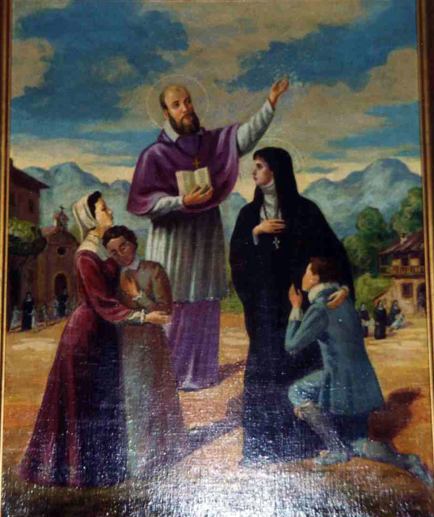 Johanna Franziska von Chantal verlässt ihre Familie um mit Franz von Sales die Heimsuchung zu gründen. Im Vordergrund Johannas Kinder: Marie Aimée und Françoise, vor ihr kniend: Celsus Benignus. Gemälde im Generalat der Töchter des hl. Franz von Sales in Rom, Italien