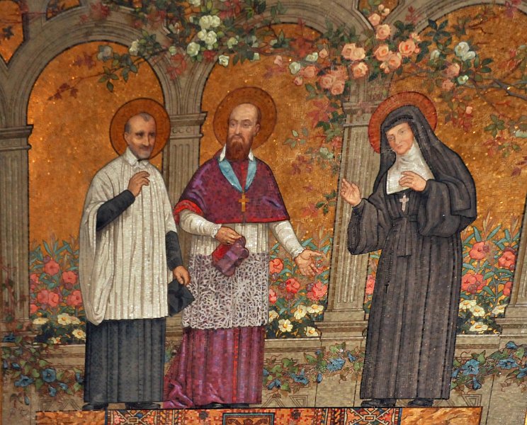 Begegnung zwischen Franz von Sales, Johanna Franziska von Chantal und Vinzenz von Paul in Paris; Mosaik in der Basilika Sacre Coeur von Paris, Frankreich