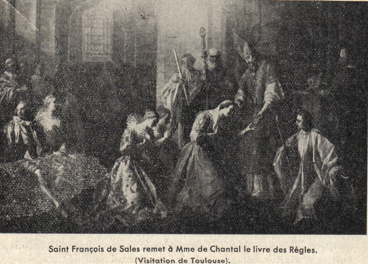 Franz von Sales übergibt den ersten Heimsuchungsschwestern die Ordensregeln, Abb. aus Annales Salesiennes 41,139. Das Originalgemälde befindet sichim Heimsuchungskloster von Toulouse, Frankreich