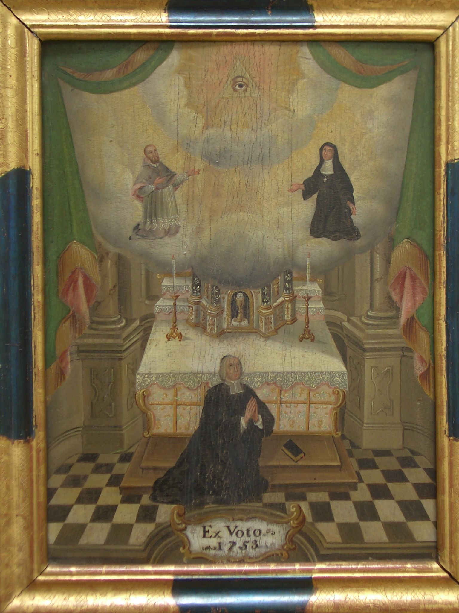Ex Voto Bild 1753: Franz von Sales und Johanna Franziska von Chantal haben geholfen. Gemälde im Heimsuchungskloster von Fribourg, Schweiz