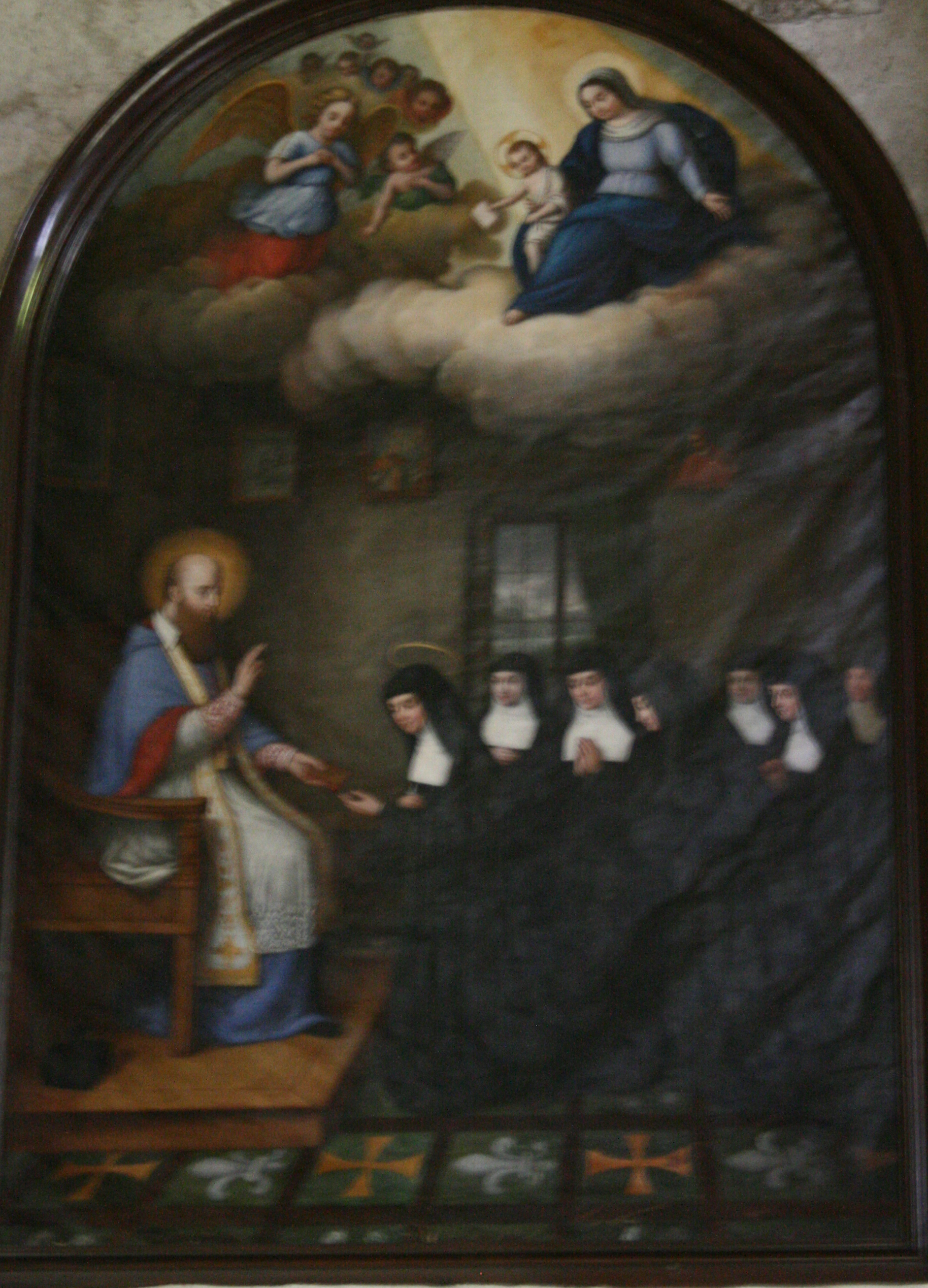 Franz von Sales übergibt Johanna Franziska von Chantal die Ordensregeln. Gemälde im Heimsuchungskloster von Nevers, Frankreich