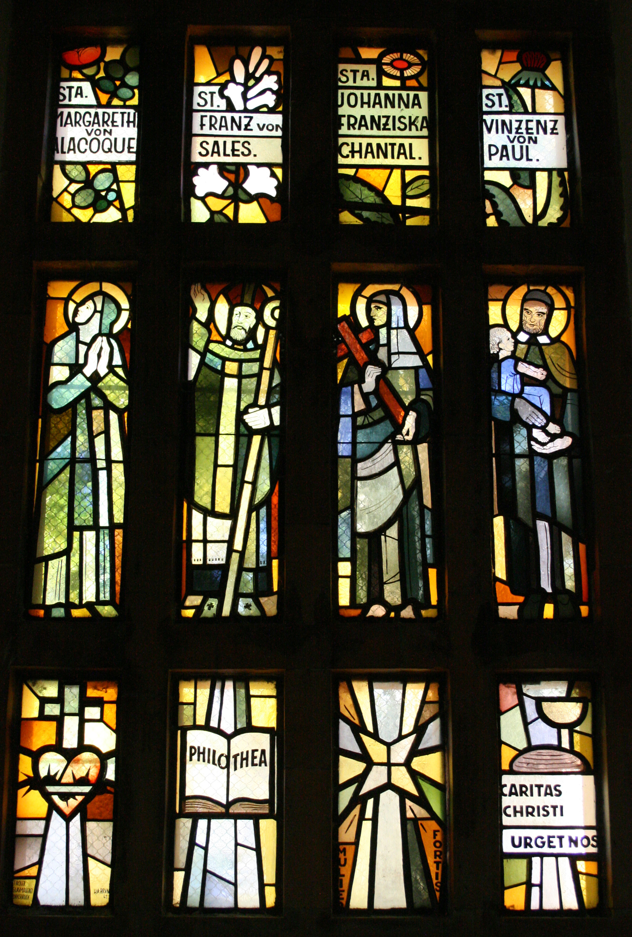 Glasfenster in der Pfarrkirche Christkönig, Neufünfhaus, Wien, Österreich; von links: Margareta Maria Alacoque, Franz von Sales, Johanna Franziska von Chantal, Vinzenz von Paul