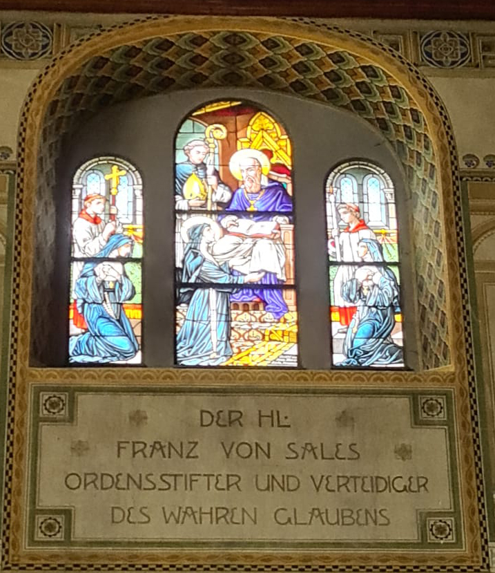 Franz von Sales übergibt Johanna Franziska von Chantal die Ordensregeln, Glasfenster in der Pfarrkirche Plaffeien, Schweiz