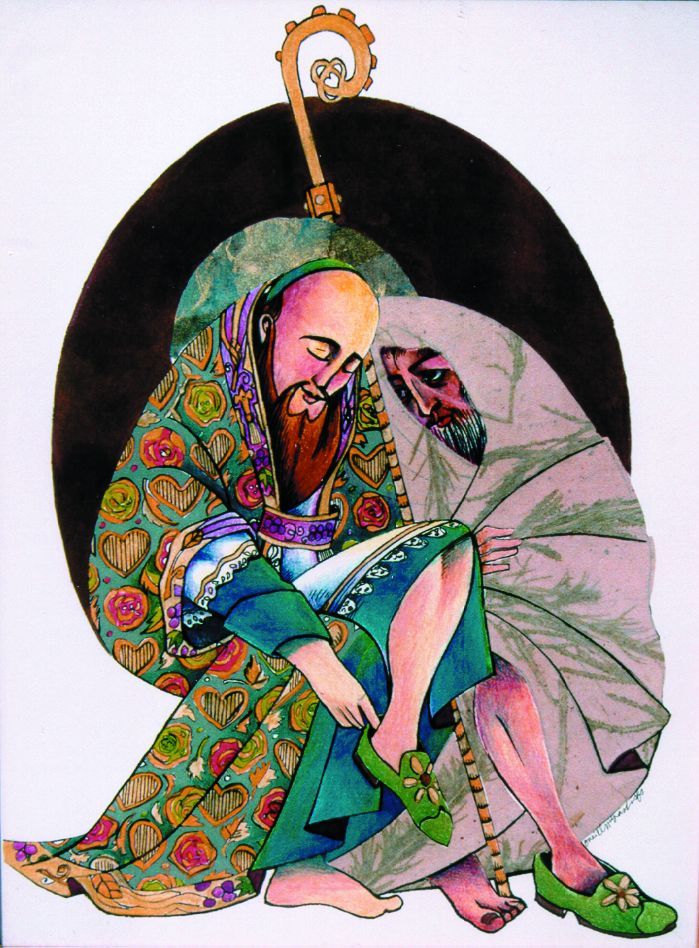 Franz von Sales hilft einem Bettler, Gemälde von Michael O'Neill McGrath osfs, USA - BeeStill-Studio, www.beestill.org
