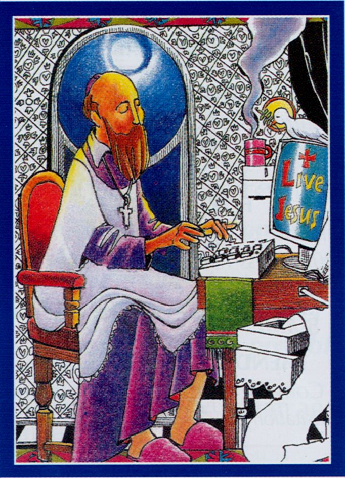 Franz von Sales am Computer, Gemälde von Michael O'Neill McGrath osfs, USA - BeeStill-Studio, www.beestill.org