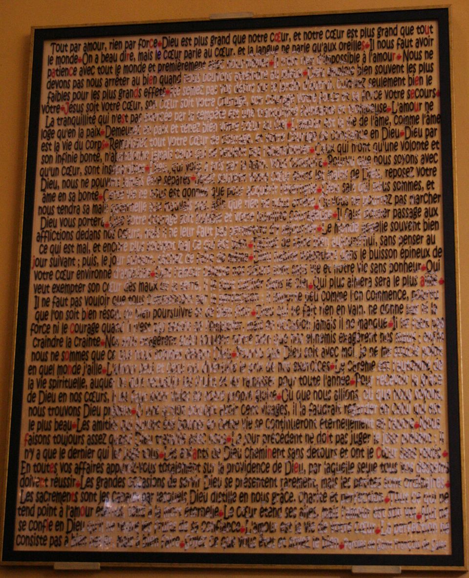 Kunstwerk in der Basilika der Heimsuchung in Annecy, Frankreich. Das Portrait des hl. Franz von Sales ist aus Zitaten aus seinen Werke zusammengesetzt.