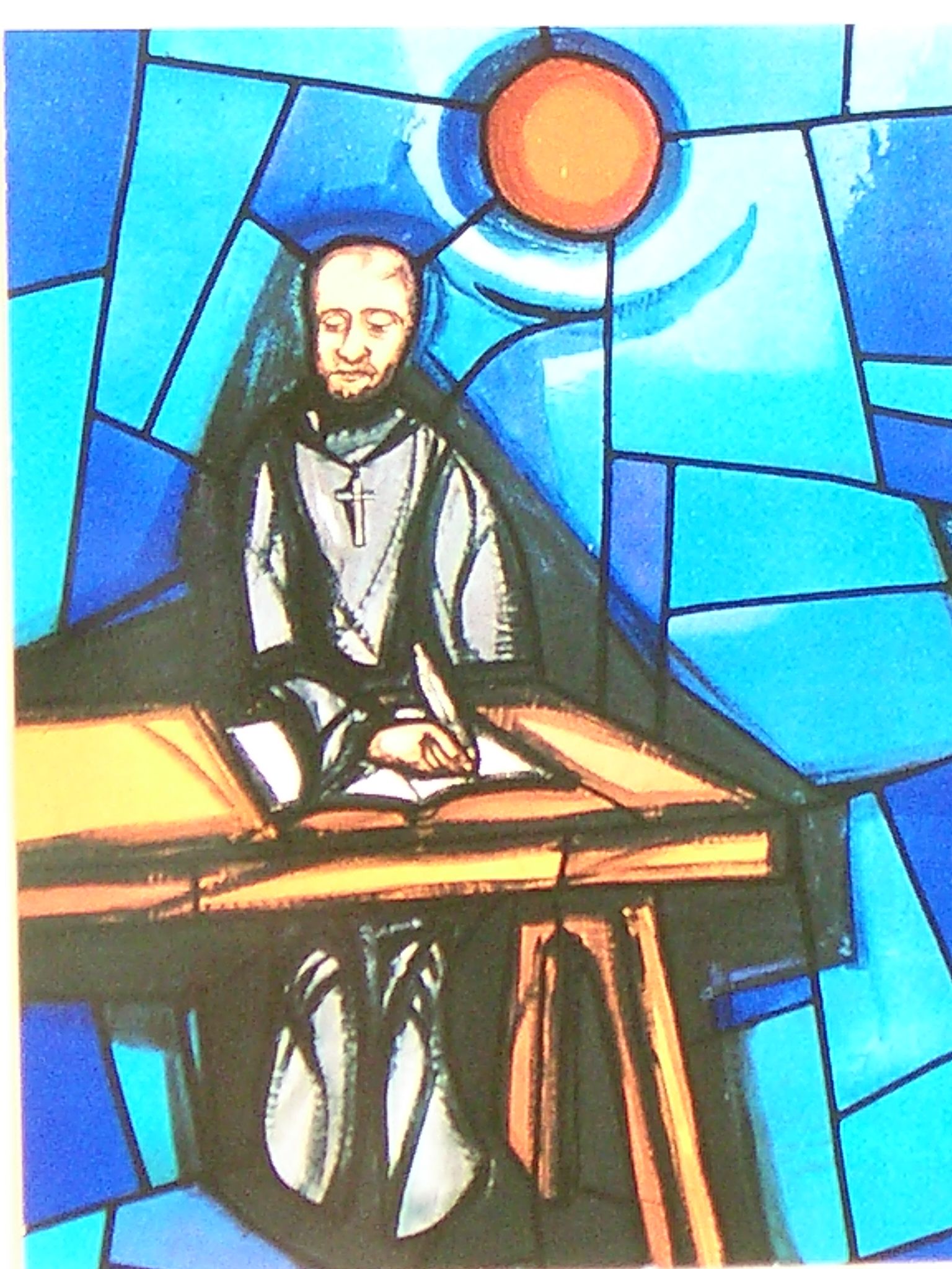 Franz von Sales, der geistliche Schriftsteller und Autor der "Abhandlung über die Gottesliebe" (1616). Glasfenster von Willy Kaufmann in der Franz von Sales Kirche von Mailand, Italien