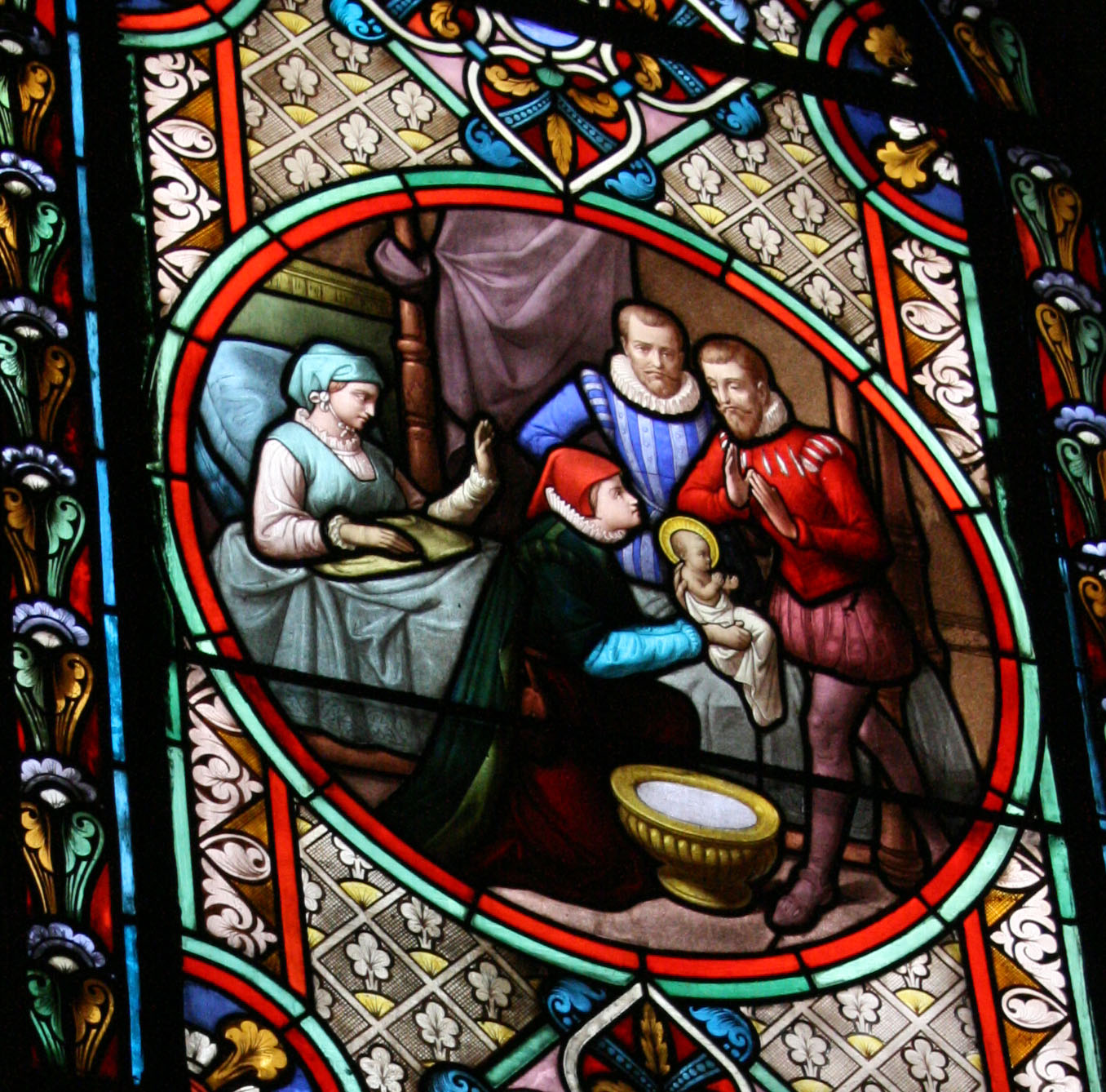 Franz von Sales wird am 21. August 1567 in Thorens geboren und notgetauft. Die feierliche Taufe findet am 28. August 1567 statt. Glasfenster in der Alten Pfarrkirche Franz von Sales in Paris, Frankreich (Ausschnitt).