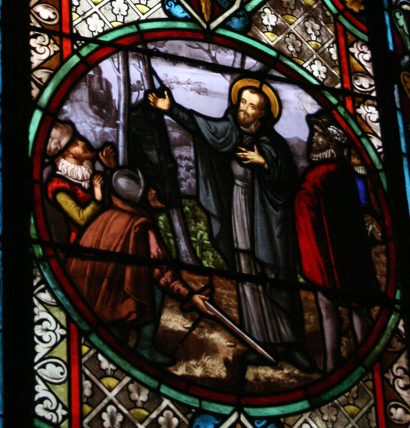 Von 1594 bis 1598 missioniert Franz von Sales erfolgreich den Chablais. Glasfenster in der Alten Pfarrkirche Franz von Sales in Paris, Frankreich (Ausschnitt).