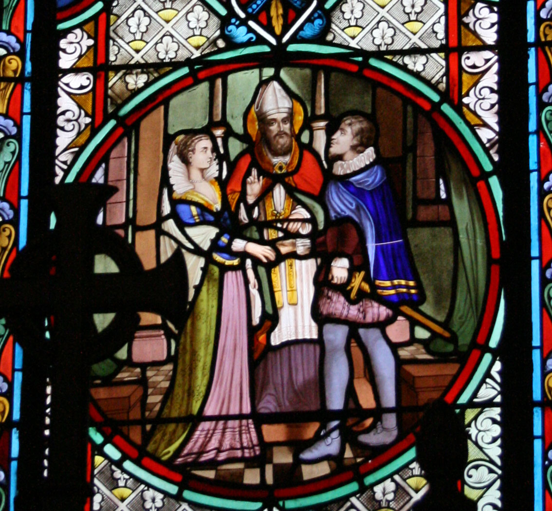 1609 heiratet der Bruder des heiligen Franz von Sales - Bernhard - die Tochter der heiligen Johanna Franziska von Chantal - Marie Aimee. Glasfenster in der Alten Pfarrkirche Franz von Sales in Paris, Frankreich (Ausschnitt).
