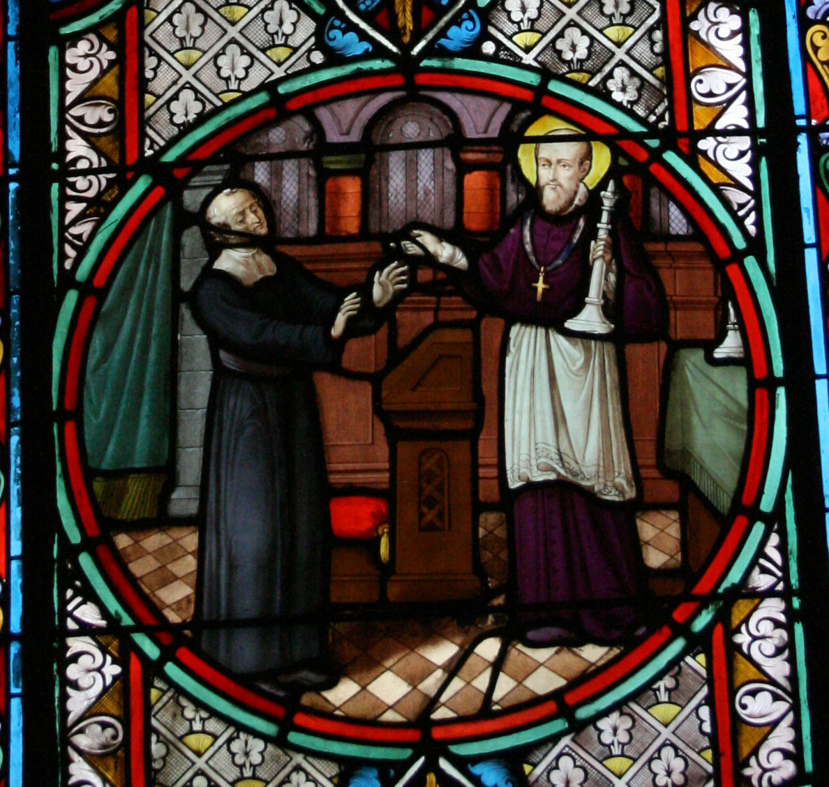 Franz von Sales hatte stets ein Herz für die Armen. Er verschenkte dafür sogar seine Silberleuchter. Glasfenster in der Alten Pfarrkirche Franz von Sales in Paris, Frankreich (Ausschnitt).