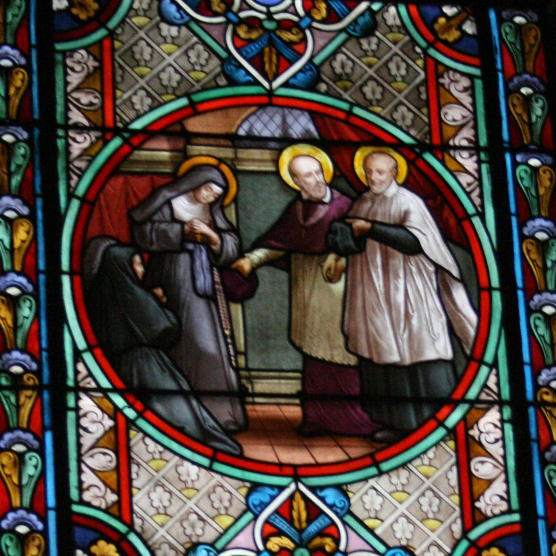 1619 kam es in Paris zur Begegnung zwischen Franz von Sales und dem heiligen Vinzenz von Paul. Glasfenster in der Alten Pfarrkirche Franz von Sales in Paris, Frankreich (Ausschnitt).