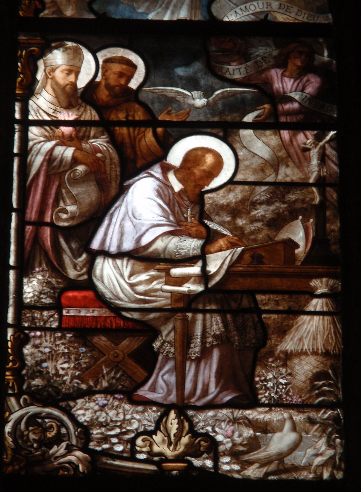 Franz von Sales, der geistliche Schriftsteller der Gottesliebe ... im Hintergrund Augustinus und Bernhard von Clairvaux, Glasfenster in der Kirche Saint Nizier in Lyon, Frankreich
