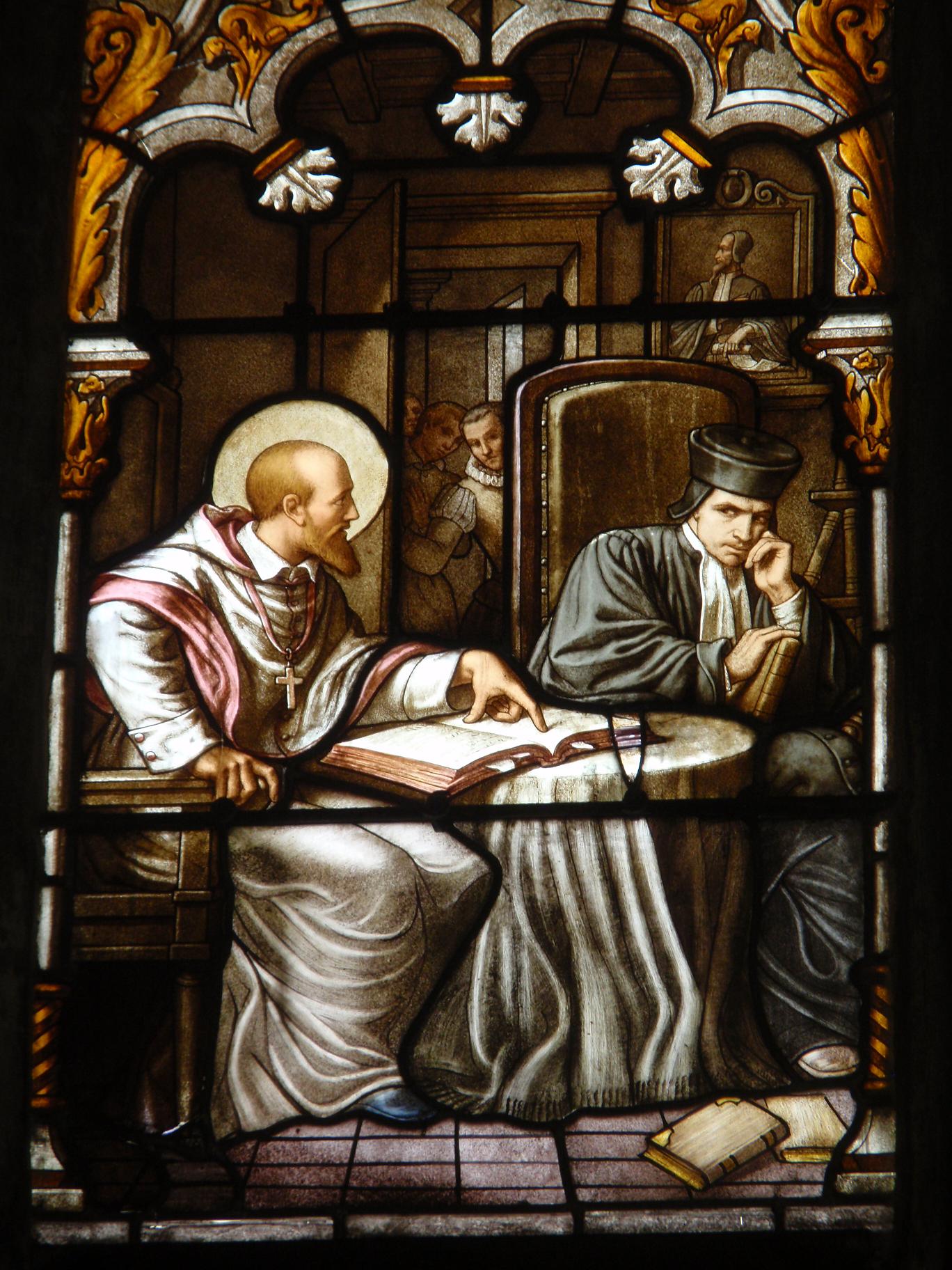 Franz von Sales im Gespräch mit dem Calvinisten Theodor de Béze in Genf, Glasfenster in der Kirche Saint Nizier in Lyon, Frankreich
