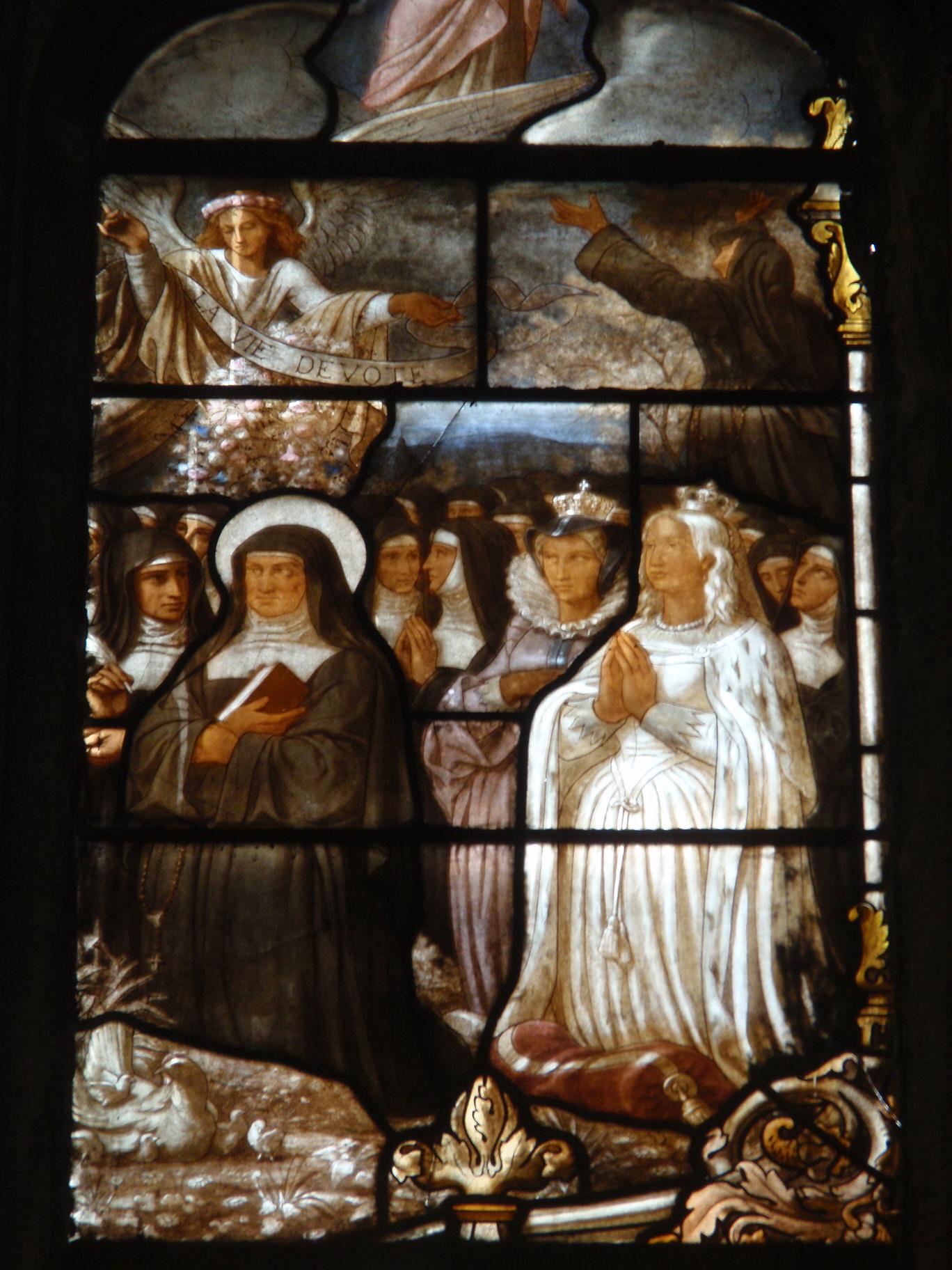 Johanna Franziska von Chantal und die Heimsuchungsschwestern, Königin Anna von Österreich und Herzogin Christine von Frankreich, Glasfenster in der Kirche Saint Nizier in Lyon, Frankreich