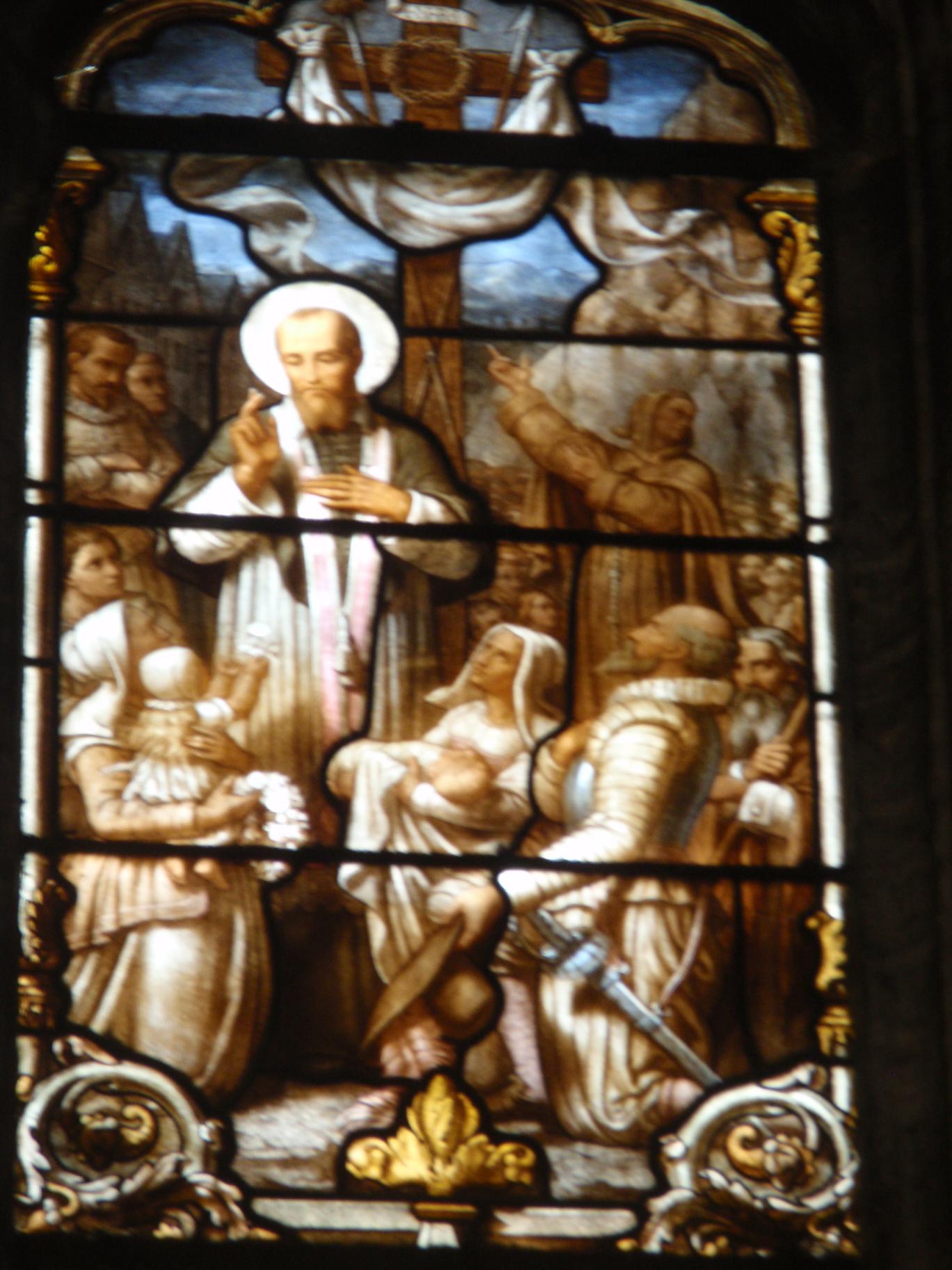 Bischof Franz von Sales als Seelsorger: allen alles werden, Glasfenster in der Kirche Saint Nizier in Lyon, Frankreich