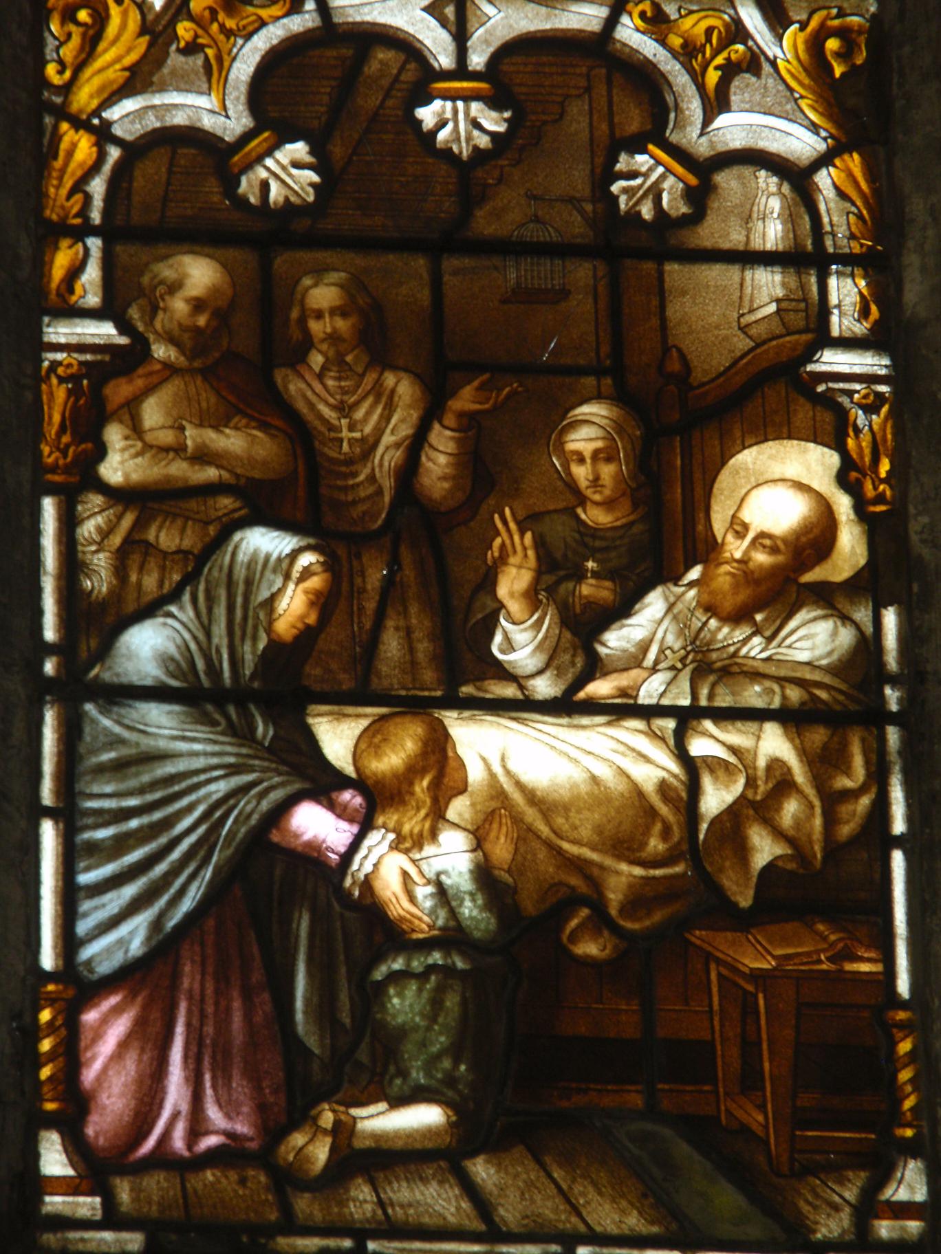 Franz von Sales stirbt in Lyon, Glasfenster in der Kirche Saint Nizier in Lyon, Frankreich