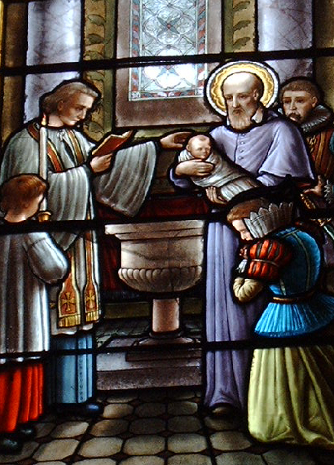 Franz tauft ein Kind in Seysell. Glasfenster in der Pfarrkirche von Seysell, Frankreich