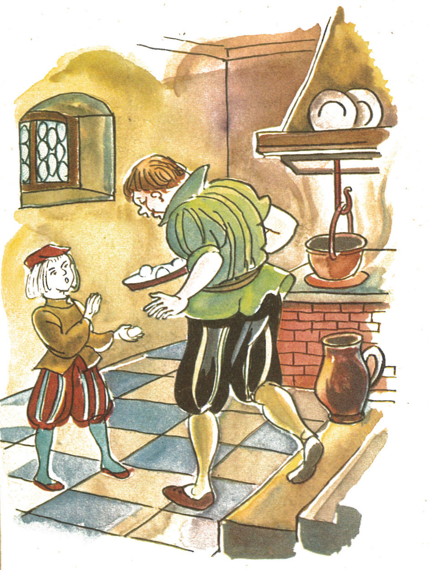 Franz von Sales bekommt als 5-jähriger vom Koch einen Kuchen, der ihm fast die Finger verbrannte, Illustration von Horst Kühnel aus dem Buch "Der heilige Franz von Sales" von Robert Skorpil, Verlag für religiöses Schrifttum Dr. Krueckemeyer KG, Saarbrücken 1956, Seite 9l