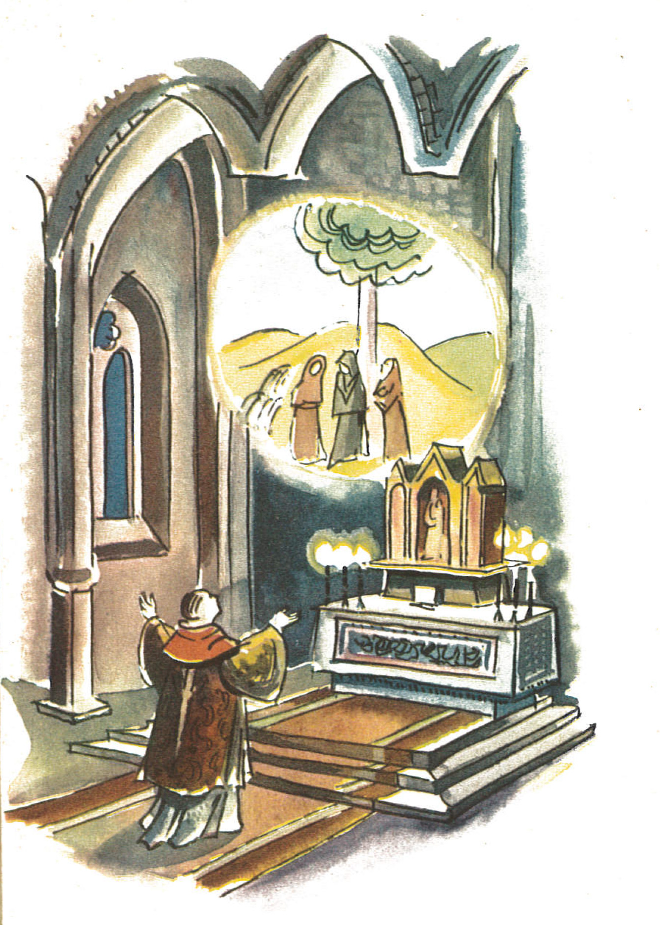Franz von Sales hat bei seiner Bischofsweihe 1602 eine Vision, Illustration von Horst Kühnel aus dem Buch "Der heilige Franz von Sales" von Robert Skorpil, Verlag für religiöses Schrifttum Dr. Krueckemeyer KG, Saarbrücken 1956, Seite 19
