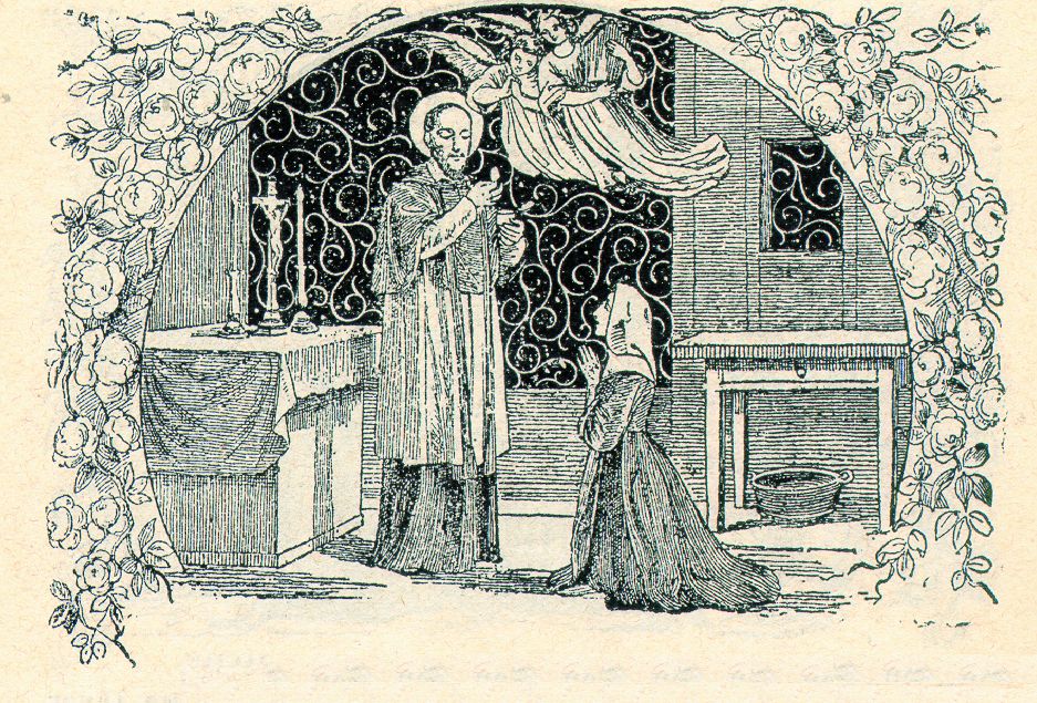 Franz von Sales reicht Anne Jacqline Coste in Genf die Kommunion. Aus: Das Leben des hl. Franz von Sales v. Marquis de Ségur, Strassburg 1896, Frankreich
