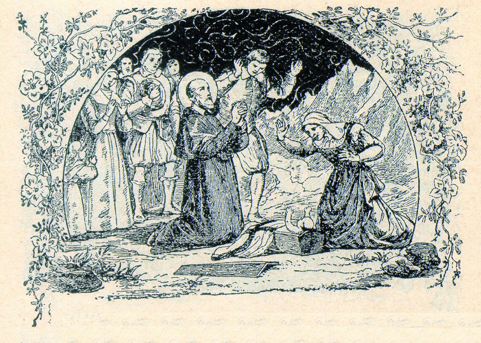 Franz von Sales betet und ein totes Kind wird wieder lebendig. Aus: Das Leben des hl. Franz von Sales v. Marquis de Ségur, Strassburg 1896, Frankreich