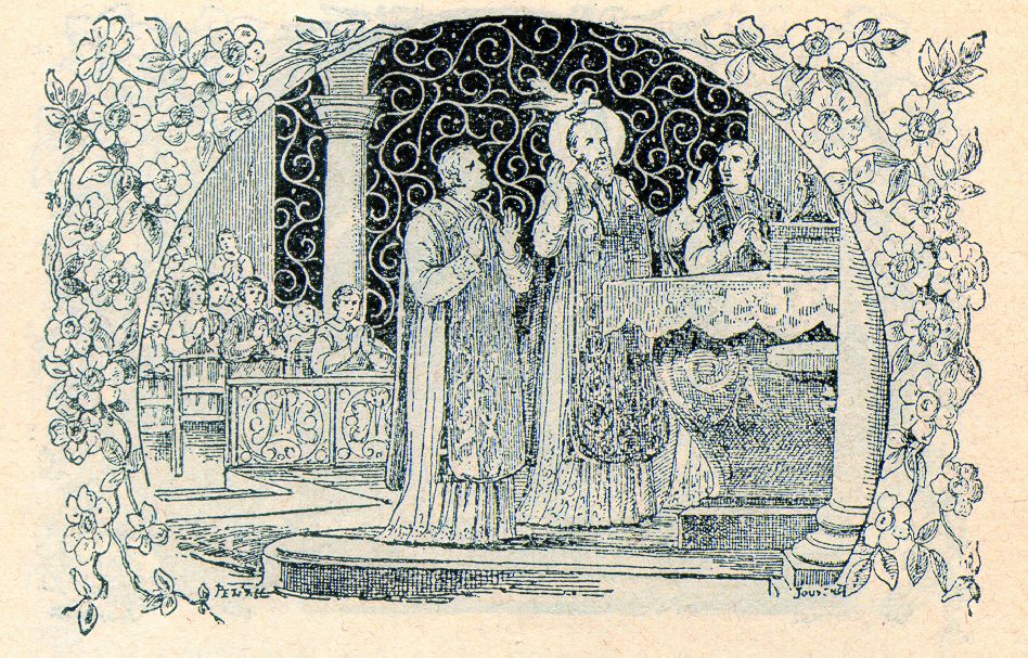 Franz von Sales als sich beim Pfingsfest eine Taufe auf ihn herabließ. Aus: Das Leben des hl. Franz von Sales v. Marquis de Ségur, Strassburg 1896, Frankreich