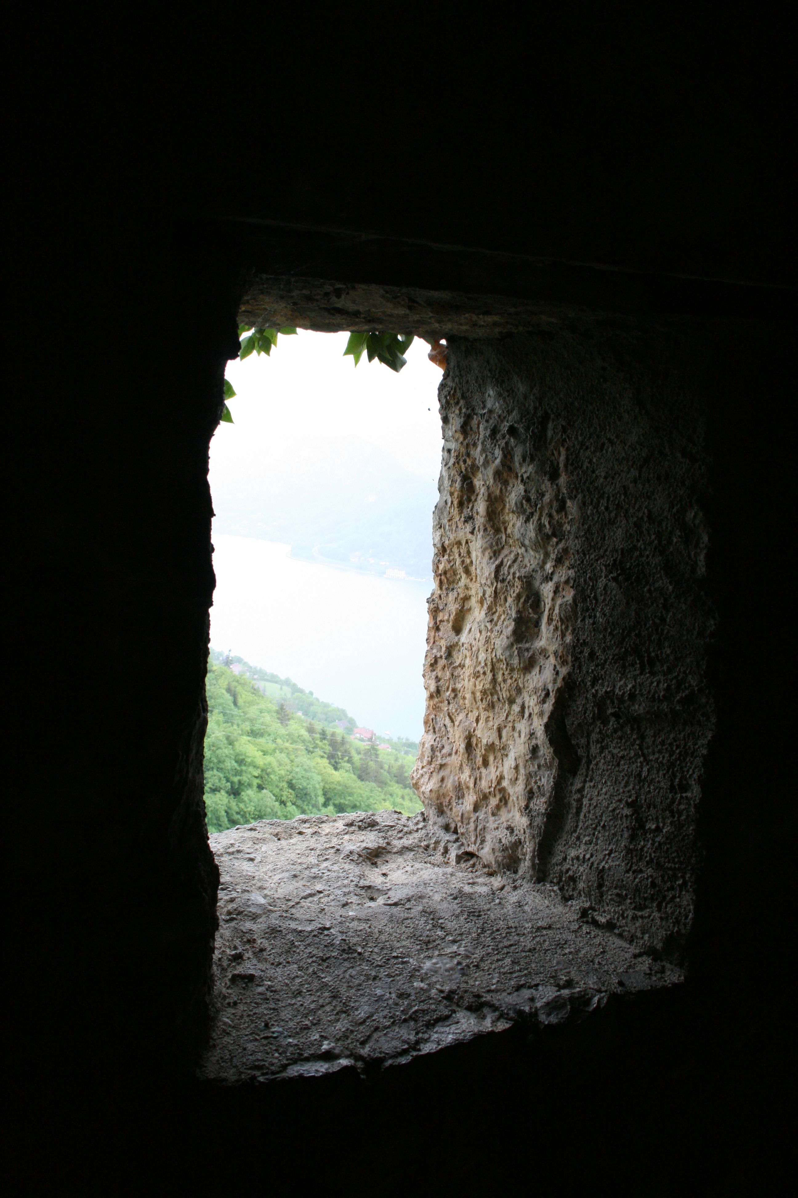 Die Einsiedelei von Saint Germain am See von Annecy, Frankreich. Blick von der Grotte des hl. Germanus auf den See von Annecy
