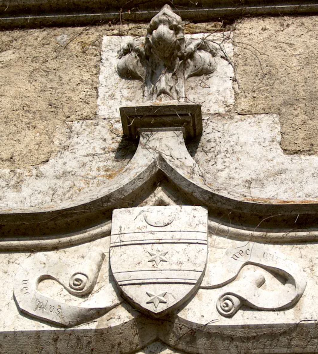 Bischofswappen des hl. Franz von Sales am Eingang zum Schloss Sales bei Thorens, Frankreich. Das Motto "Ny plus ny moins" - "Nicht mehr und nicht weniger" war das Motto der Familie Sales. Franz von Sales änderte es bei seiner Bischofsweihe in "Non excidet" - "Er, sie, es wird nicht untergehen".