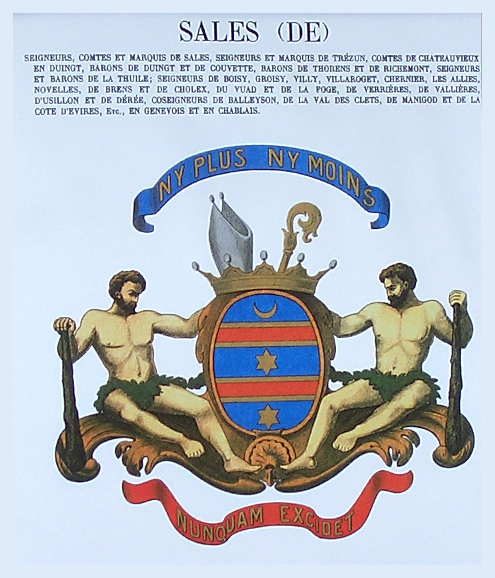 Familienwappen / Bischofswappen der Sales: Oben der Leitspruch der Familie: Nicht mehr und nicht weniger. Unten der Leitspruch des Bischofs: Niemals verlorengehen. Rechts und Links Castor und Polux, Sterbild der Zwillinge. Gemälde im Schloss Sales bei Thorens, Frankreich