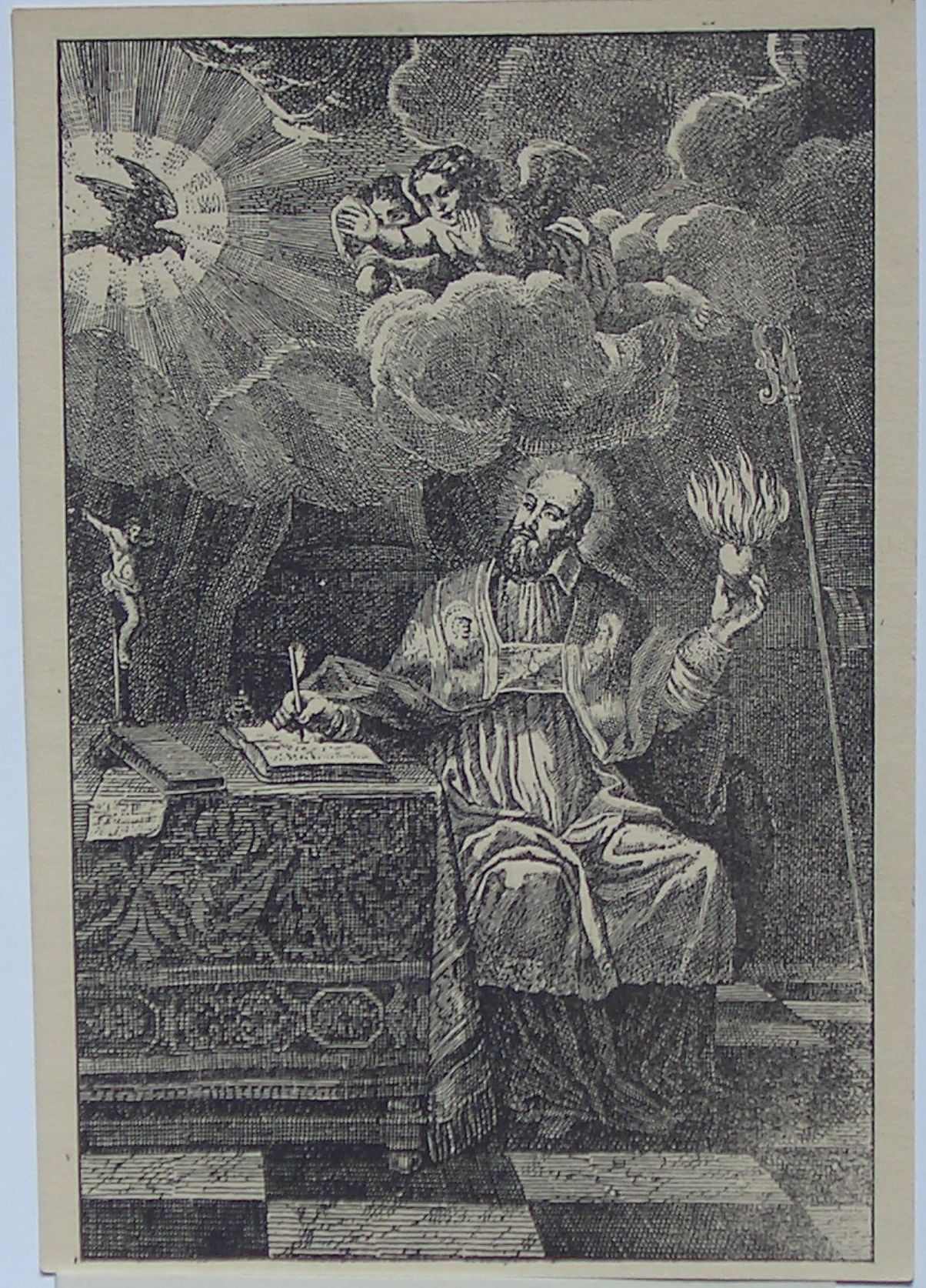 Der hl. Franz von Sales schreibt inspiriert vom heiligen Geist die Abhandlung über die Gottesliebe (Theotimus), Stich im Heimsuchungskloster von Solothurn, Schweiz