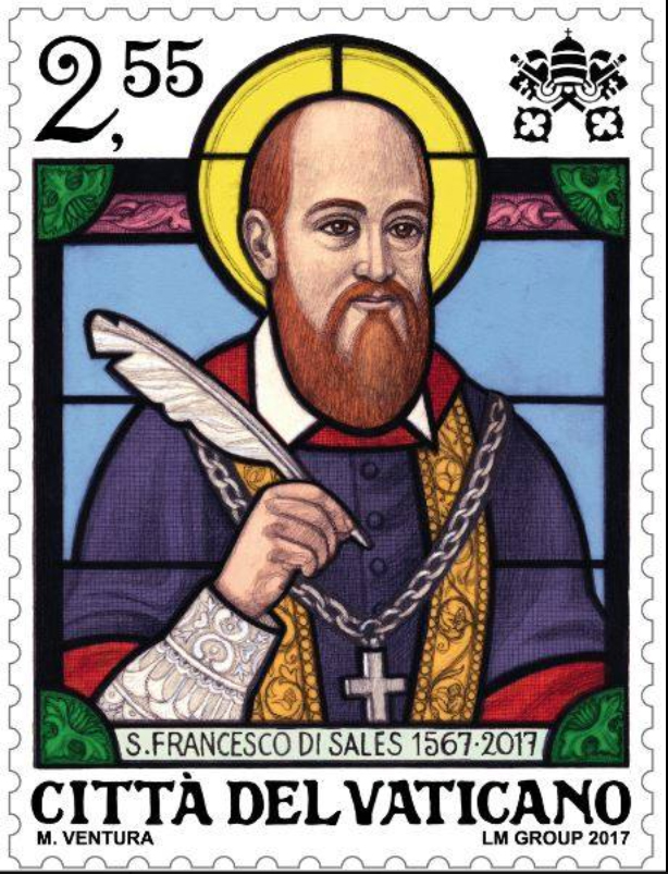 Breifmarke aus dem Vatikan zur Erinnerung an den 450. Geburtstag des heiligen franz von Sales (1567-1622), erschienen am 23.11.2017, gestaltet vom italienischen Künstler und Illustrator Marco Ventura.
