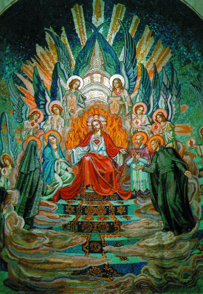Margareta Maria Alacoque, Gottesmutter Maria, Jesus Christus, Franz von Sales, Columbiere Mosaik in der Kapelle La Columbière in Paray-le-Monial, Frankreich.