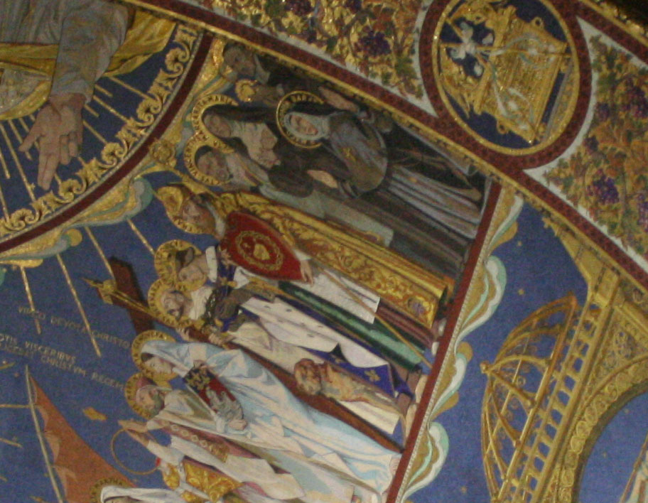 Der heilige Franz von Sales inmitten der Schar jener Heiliger, die zur Herz Jesu Verehrung beitrugen. Ausschnitt aus dem Apsismosaik über dem Hochaltar der Basilika Sacre Coeur, Paris, Frankreich.