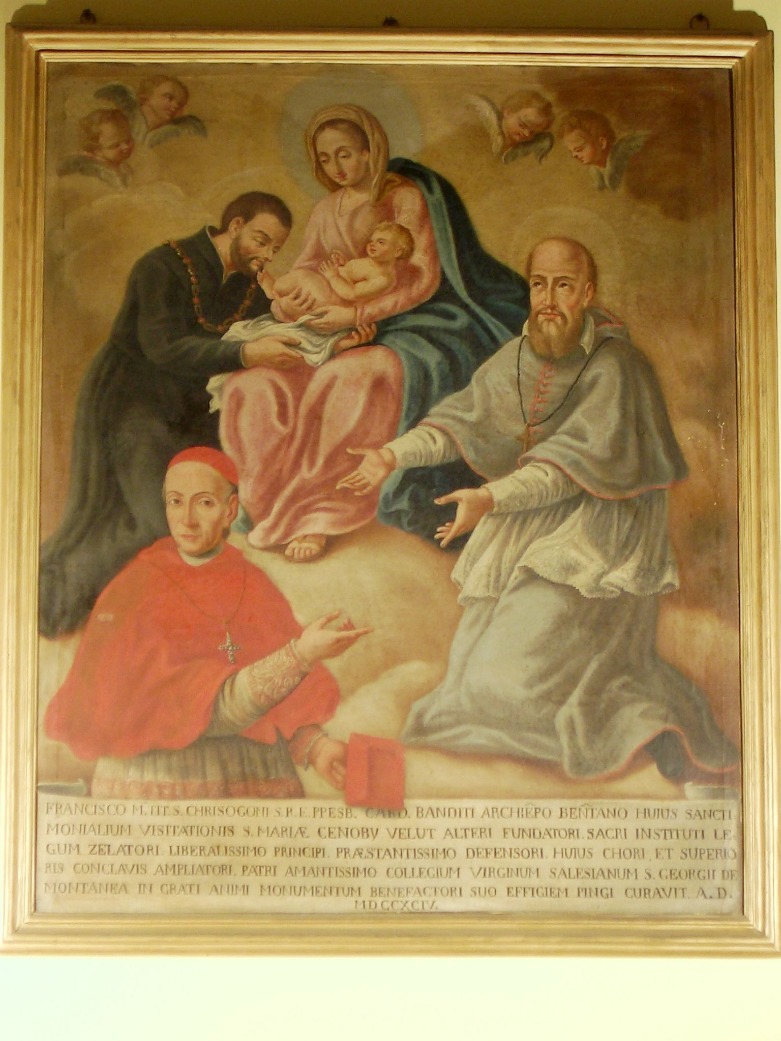 Franz von Sales (rechts) und der hl. Chrysostomos (links). Gemälde zum Dank für die Renovierung des Klosters an den damaligen Kardinal und großen Spender Francisus Maria Banditi (unten) im Heimsuchungskloster San Giorgio del Sannio, Italien