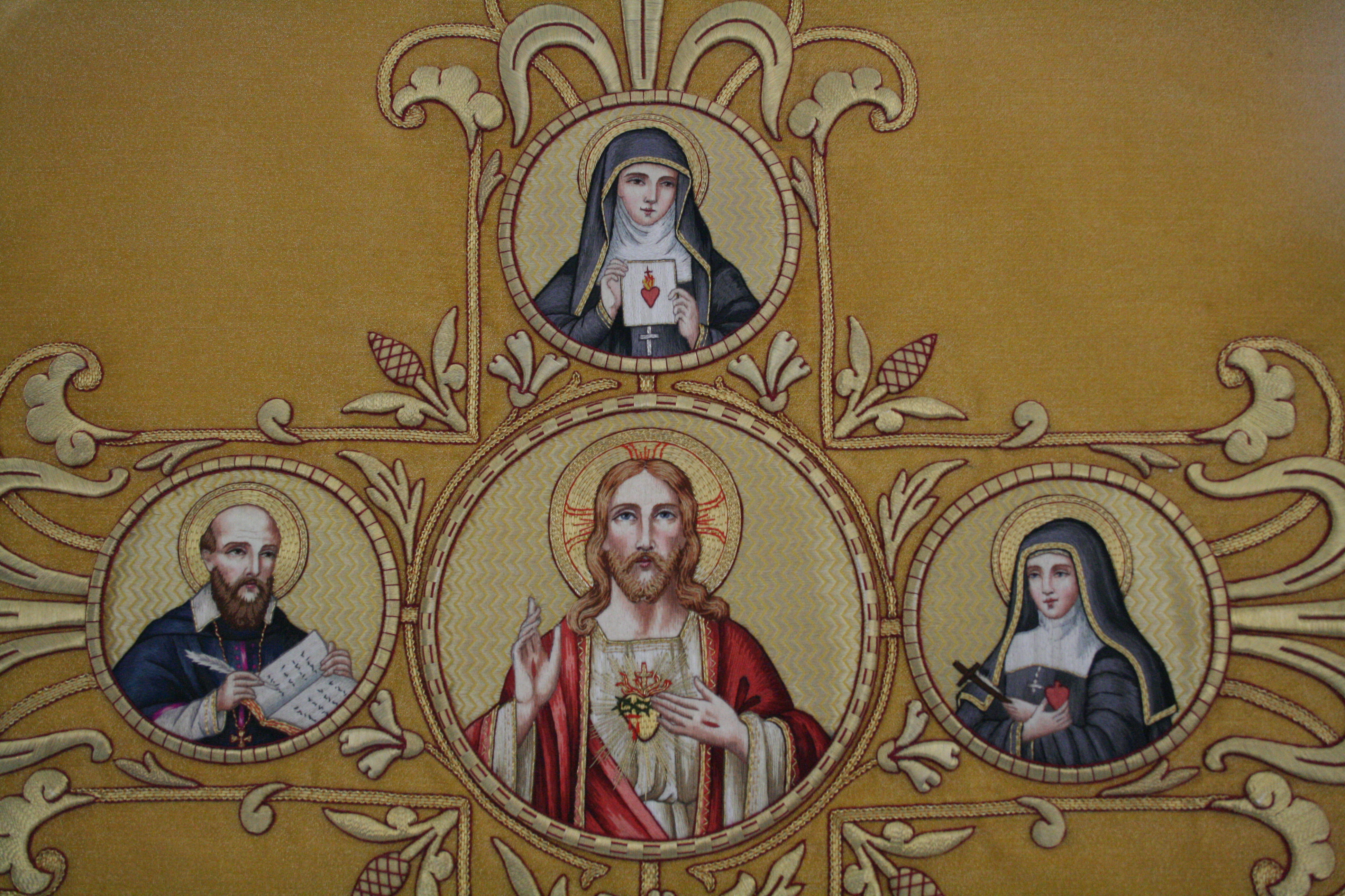 Franz von Sales, Margareta Maria Alacoque (oben) und Johanna Franziska von Chantal verehren das Herz Jesu, Stickerei im heutigen Kloster der Heimsuchung in Moulins, Frankreich