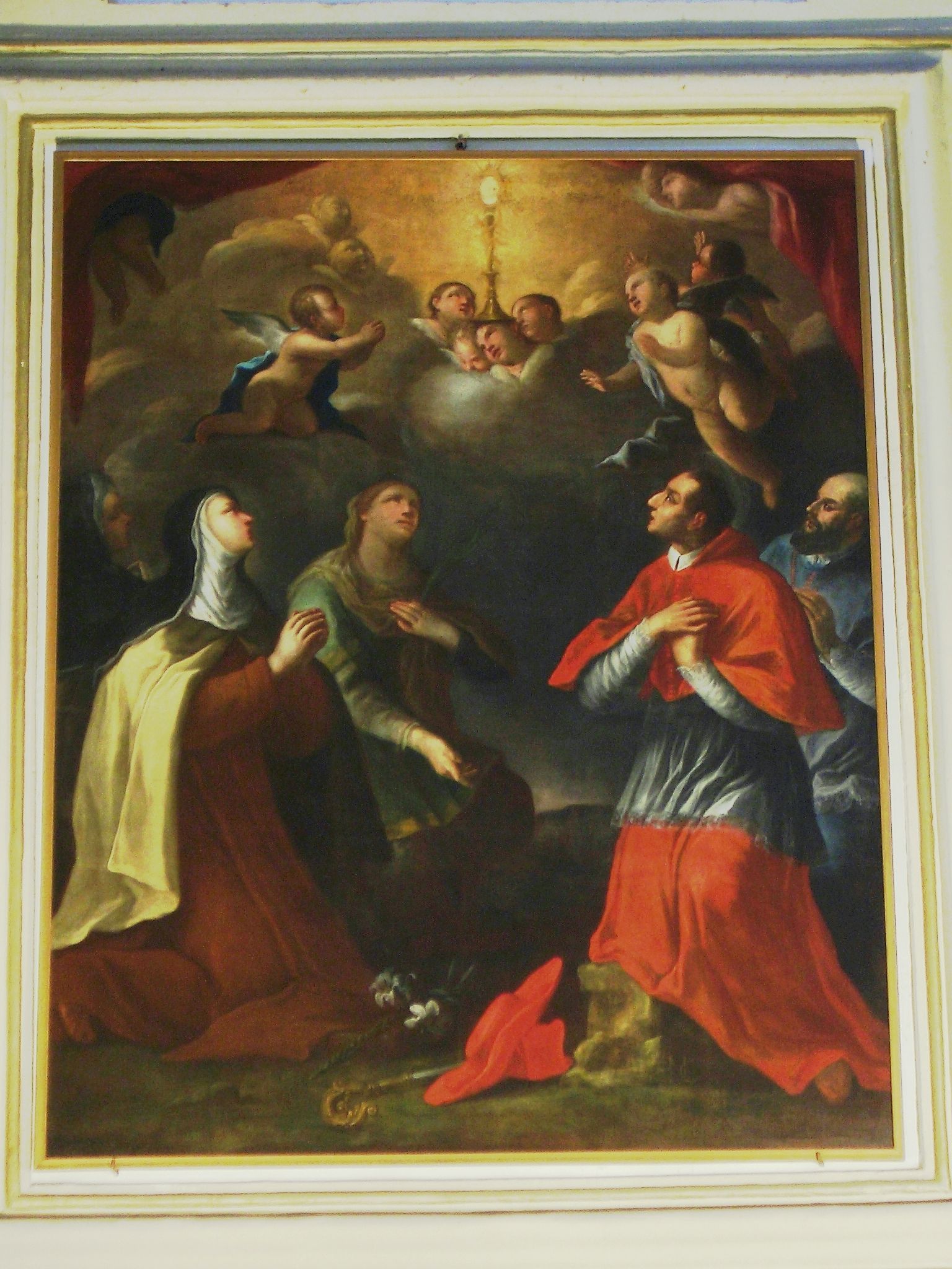 Vier Kirchenlehrer: Teresa von Avila, Katharina von Siena, Karl Borromäus und Franz von Sales. Gemälde in der kirche Madre di San Giorgio del Sannio, Italien
