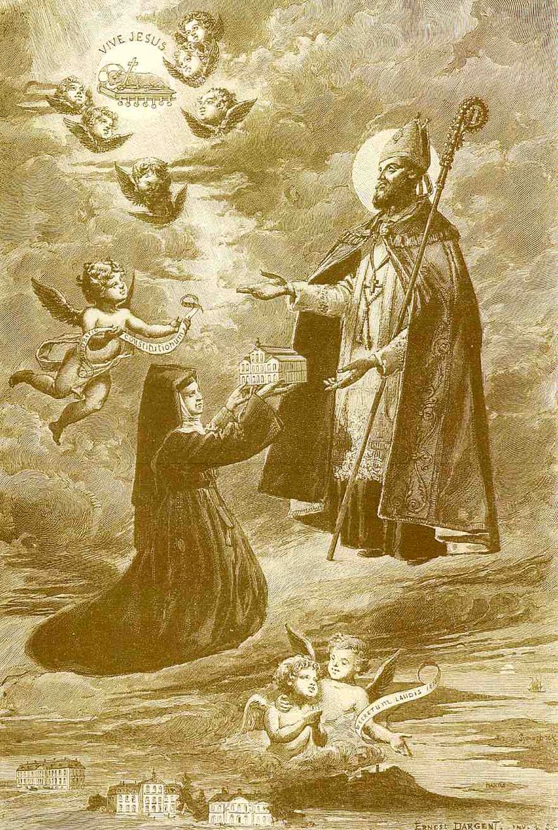 Franz von Sales empfängt von Marie de Sales Chappuis die Satzungen der Oblaten des hl. Franz von Sales. Franz von Sales übergibt diese dem Lamm Gottes. Stich von Ernest Dargent in der Schule St. Bernard, Troyes, Frankreich.